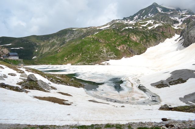 Dopo circa un’ora e quaranta minuti si raggiunge il rifugio Lambertenghi Romanin, letteralmente circondato dalla neve; in un paio di minuti si arriva poi al Passo Volaia, che segna il confine con l’Austria, da cui si può godere di un panorama abbastanza irreale per essere metà giugno: tantissima neve che circonda un lago semi ghiacciato.